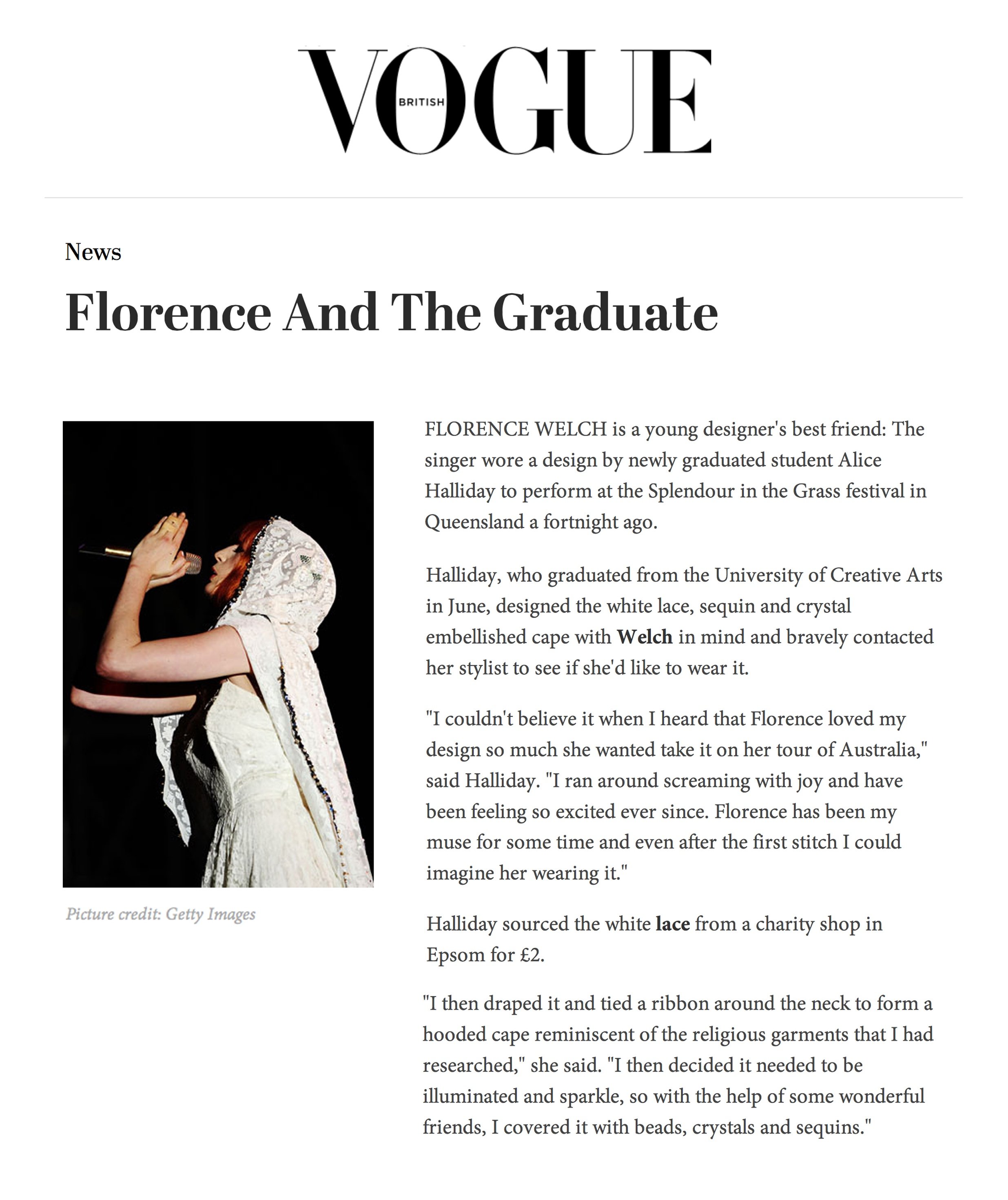 Alice Halliday is the Designer/Creator of the white lace cape worn by style icon Florence Welch of Florence + the Machine, as seen in Vogue.
